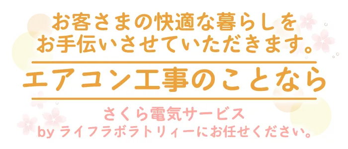 さくら電気サービスbyライフラボラトリィーは群馬県前橋市を拠点に、エアコン工事全般を行なっております。エアコン取り付け・設置・交換・取り外しはもちろん、新品エアコンの販売や中古エアコンの取り付け・交換なども請け負っています。お客さま目線の施工を心がけ、確実な施工をお約束いたします。